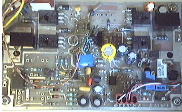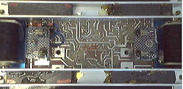 | Construction du vehicule autonome Les 2 canaux sont alimentés par 2 batteries 9 V (18 V). Le long fil à gauche est utilisé pour le "ravitaillement en vol" (réglages et mesures). Les 2 cartes analogiques superposées, dessinées spécialement aux dimensions de ce modèle, constituent le "châssis" du véhicule. L'alimentation est basée sur 3 régulateurs RECOM R-7812-0.5 permettant d'extraire le maximum des 2 batteries 9 volts, l'auto-balance et l'arrêt automatique sont des fonctions qui contribuent également à la longévité des batteries. Description & Schéma d'une des 2 cartes |